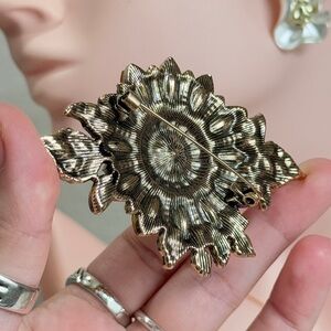 Stunning sunflower brooch with yellow and green gemstones. Perfect for adding a touch of elegance.