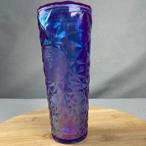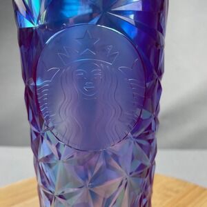 Starbucks iridescent gem tumbler cold cup with lid. This 24 ounce reusable cup showcases a faceted geometric design that shimmers with purple and blue hues. The iconic Starbucks siren logo is embossed on the front. Includes a matching faceted lid with a straw hole. Tag still attatched to bottom of cup.