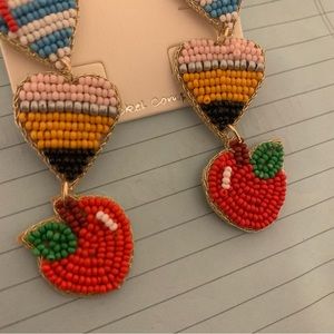 Teacher earrings. Beaded. Notebook paper. Pencil. Apple. Heart shaped. Cute and fun. Lightweight. Approximately 3”x1”. Boutique.