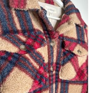 New with tags L*SPACE Big Sur cropped sherpa jacket in cream, magenta, and navy plaid. Collared design with button closure and double breast pockets. Cozy textured sherpa material perfect for layering.