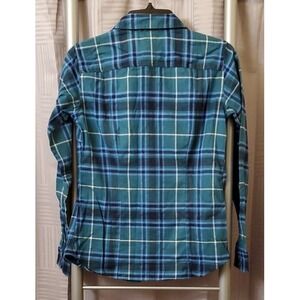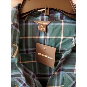 This stylish Eddie Bauer button-up shirt for women features a green and blue plaid pattern that's perfect for any casual occasion. With long sleeves and a collared neckline, this shirt is made from 100% cotton flannel, making it comfortable and machine washable. It comes in XS size, fits regular, and is not vintage or handmade.
