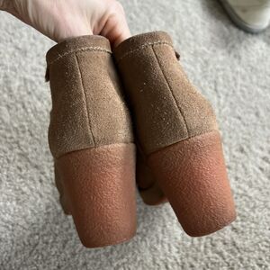 These are Camper ankle boots for women in size 36 EU and 6 US. The light brown suede bootie features a lace-up closure and a mid-height block heel. Made of leather with a leather lining, the boots are lightweight and comfortable. The style is versatile for casual occasions, with a bohemian, retro, and cowgirl theme. Perfect for those who appreciate a hipster or hippie look.
