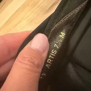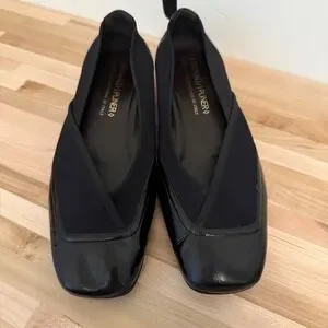 Keywords: Donald Pliner, ballet flats, leather flats, black flats, square toe shoes, elastic flats, comfort shoes, designer flats, slip on shoes, womens shoes, size 7.5M, artis