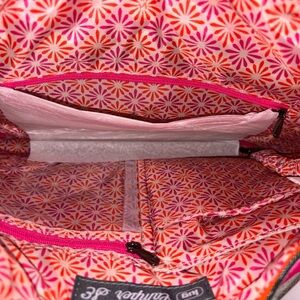 Bright pink bag with quilted design. Features multiple zippered pockets. Ideal for daily use.