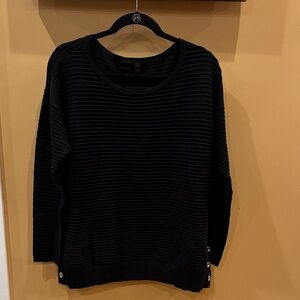 Rafaella Women Elegant black ribbed sweater with crew neck. Features button accents. Ideal for versatile styling. size Large: relaxed fit