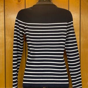Elevate your wardrobe with this classic navy and white striped women's sweater. Perfect for layering and adding a touch of elegance to any outfit.