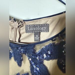 Like new condition. Never been worn. Chic Luxology dress with navy floral patterns on beige. Long sleeves add elegance. Ideal for versatile wear. Size 10. Approx measurements across chest 20” waist 23-24” has a littl stretch and length 36”