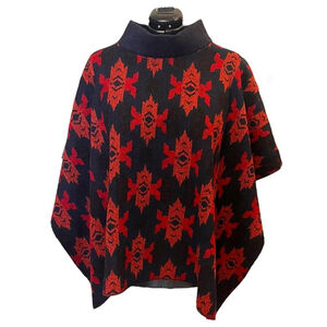 Crafted with intention and bold design, this poncho brings warmth and presence to any outfit. The striking red geometric motif, woven across a deep navy-black base, echoes the artistry of traditional South American textiles while reimagining them for modern wear. The high collar adds structure, while the generous cut offers effortless layering. Made of a substantial, heavyweight fabric (likely wool or a wool blend), this piece is ideal for cooler seasons and transitional weather.