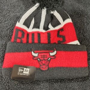 New Era knit beanie featuring Bulls logo. Red, black, and gray stripes with pom-pom.