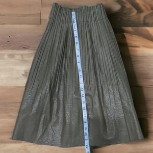 Elevate your wardrobe with this stunning Anthropologie pleated skirt in a gorgeous moss green color. Made with high-quality vegan leather, this skirt features raw hem accents and a comfortable elastic waist closure. The mid-rise skirt falls above the knee, making it perfect for any occasion whether it's a party, business meeting, or casual outing.