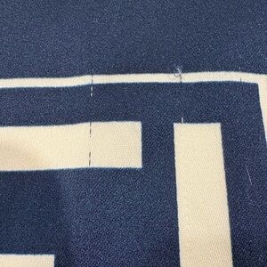 Pre owned: There are a few very small pulls/snags in the material. There are also a couple of faint, small dark marks on the solid navy blue border in one corner.