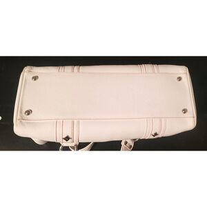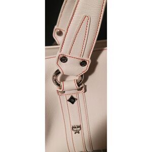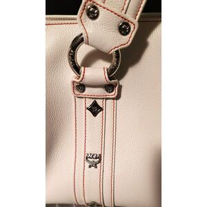 Imagine the compliments you will get carrying this gorgeous white leather MCM. The red stitching accents just make the entire purse! Crafted in leather, it is sure to make an impressive style statement, no matter what the occasion is. This piece has a nylon lined spacious interior which adds to its style and durability but also has a zipped center divider. The metal plate on the front still has the plastic cover on it but the one inside does not. The feet has very minimal scuffs - minimal! The handles have some hand oil on them and there are some very light discolorations on the front (pic 13).