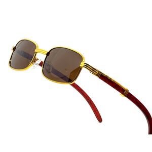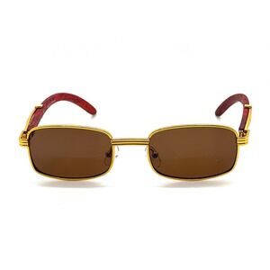 Stylish rectangular sunglasses featuring a sleek gold frame and distinctive wood-look arms. These sunglasses offer a modern twist on a classic design, perfect for adding a touch of sophistication to any outfit.