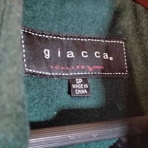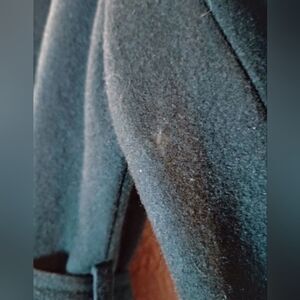 Approximately 23" flat bust, armpit to armpit, measurement. There is one little worn spot (approximately smaller than a dime) on the back of the right arm by the armpit. Button up with a belt. Color is an emerald green. One of the front pockets got partially sewn shut when a button was sewn back on. Used. Smoke free/Dog friendly home