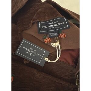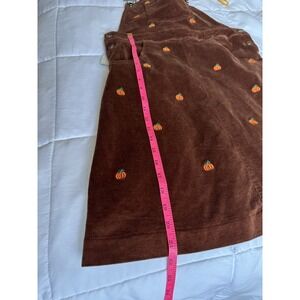 Adorable brown corduroy overall dress featuring embroidered pumpkins throughout for the perfect fall, autumn, and Halloween-ready look. Designed with adjustable overall straps, front bib pocket, and side pockets for both style and function.