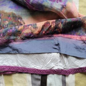 Beautiful silk dress with sunset colored tree print and ruffled cap sleeves. Comes with a mink colored velvet belt. Zips at side. Fully lined and slip is trimmed with a magenta lace.