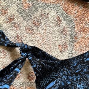Elevate your wardrobe with this black and blue rayon top. Perfect for any occasion, this top features a unique Alice in wonderland pattern and stylish tie straps. A must-have for fashion-forward individuals. ~18”~ 23.5” probably size XS-S. Handmade. Gently used condition. Ties can be adjusted for fit.