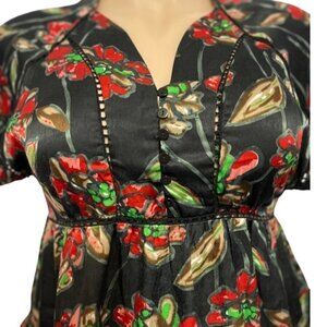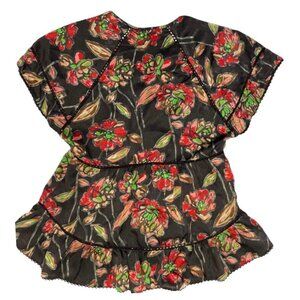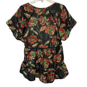 ESLEY ~ Women's boho casual cinch-waist top. Size Large. Black satin with red, green, brown, tan, salmon floral print. Button top with a side zipper. High-low ruffled bottom. Openwork trim. Shorts sleeves. Lightweight.