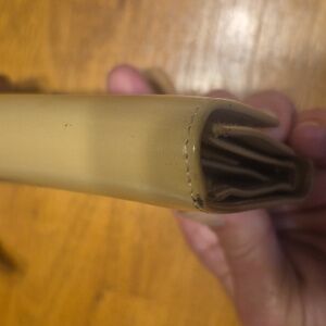 She is in good condition does have some callout there is a tear at the top in the bill compartment. she has peeling in the coin pocket. She has a spot on one top corner of the wallet, but she looked brand new from the outside.