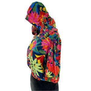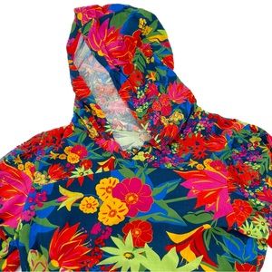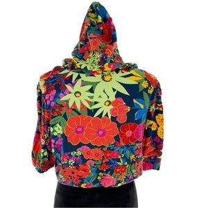 A cute cropped hoodie blouse in a bold Brazilian floral print, elastic at sleeves and waist.