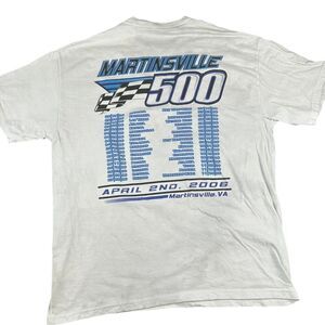 Vintage NASCAR t-shirt from the 2006 Martinsville 500 race in Virginia. Features a blue race car graphic on front and complete race schedule on back. White t-shirt in good vintage condition with bold graphics. Hanes Beefy-T brand.