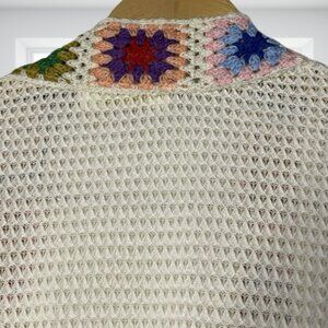 ⦁ Features: Long sleeves, open front, long length, lovely knit body, colorful granny square crochet trim. A perfect addition to your closet for a Cottagecore, Fairycore, or Hippie look!
