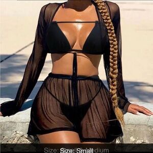 This elegant black swim set features a stylish sheer cover-up and a chic bikini. Perfect for a day at the beach or poolside lounging.