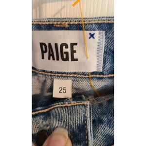 This Paige Denim skirt in medium wash is perfect for any woman's wardrobe. The solid pattern and distressed details add a touch of edginess to the classic button closure and cotton blend material. It's a size 25 and machine washable for easy care. The short, mini length and blue color make it a versatile piece for any occasion. Whether you're dressing up or down, this denim skirt is a must-have.
