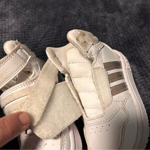 Adidas Baby High Tops in white, size 5, designed for toddler walkers. They feature an easy closure for convenience and comfort.