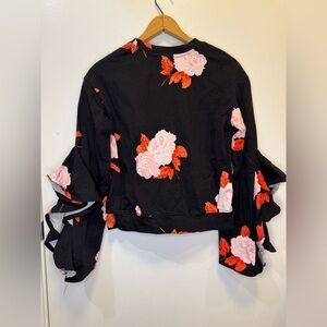 Who What Wear women’s black sweatshirt with floral print print, bell sleeves and ruffles in a size XS. Made of 100% cotton. Very cute top that is fitted. In very good preowned condition.