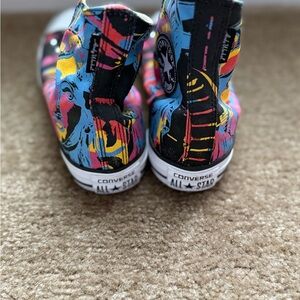 Colorful Converse All Star high-top sneakers with a vibrant graphic design. Features black, blue, pink, and yellow colors.