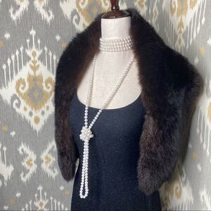Sumptuous and luxe, rich deep sable brown vintage Opossum fur pull through style rectangular oblong scarf. Fully lined with coordinating silk. Ralph stopped using fur (apart from Shearling) in 2006, so this would predate. It will add warmth, and style to any coat, blazer, or sweater. Versatile size and shape, designed with a slot, to pull one side through to hold in place, also lovely affixed with a beautiful brooch. Approx: 42” length, 8” width. Gently worn, some nuance to lining, see pics.