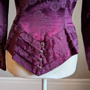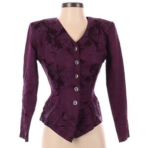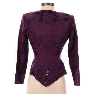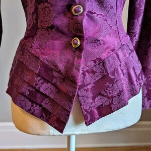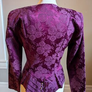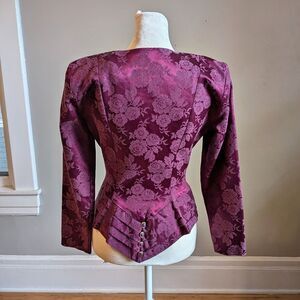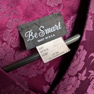 Vintage 1990s Be Smart floral blazer jacket. Burgundy red embossed floral print. Long sleeves. Shoulder pads. Button front. Button detailing on back. Tuxedo vest hem. Jacket is in good vintage condition with light wear including possible loose threads.