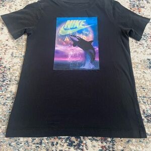 Pre-owned. Good condition. Pictures provided. Normal wash wears. Size M. Black Nike tee featuring a dynamic ocean scene. Comfort fit.