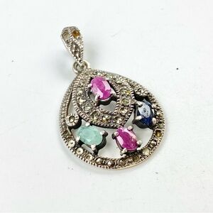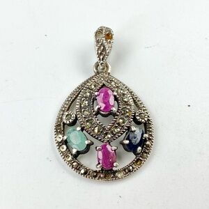 This stunning Vintage 925 Sterling Silver Gemstone Pendant is made from quality sterling silver, this necklace pendant is a teardrop shape and features intricate marcasite ( marcasites missing ) detailing and vibrant gemstones including ruby, aventurine and sapphire. Each gemstone is carefully selected for its natural beauty and unique properties.