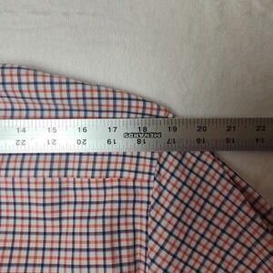Style: Mens contemporary fit long sleeve dress shirt with orange, navy, and white check pattern.