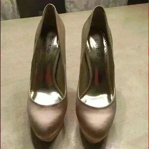 BEBE Rosario Satin Heels In Beige. Comes with Box. Worn Once. There is a tiny Knick onto heel, shown in last Pic, however In Excellent Condition. Size 7