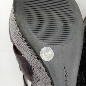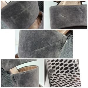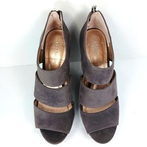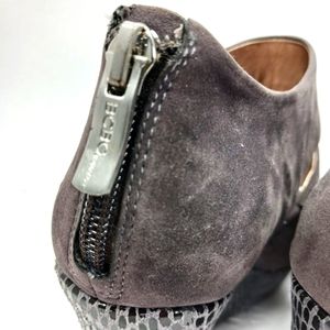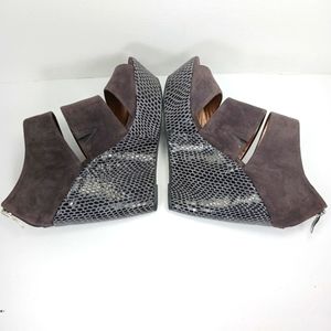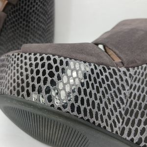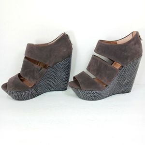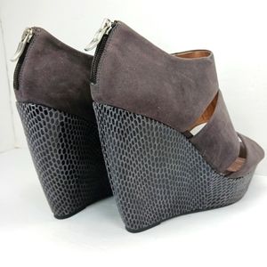 Stylish gray platform wedges. Features a suede finish and zip closure. Perfect for elevating any outfit.