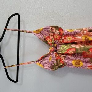 Vibrant floral design. Spaghetti straps. Flowing silhouette. Perfect for any event.