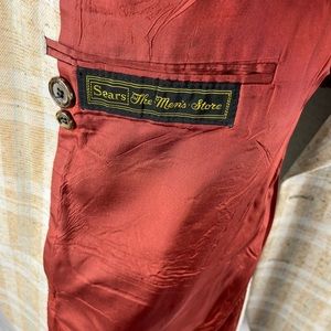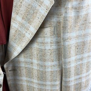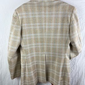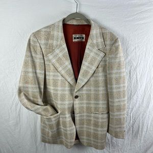 100% polyester, plaid sports coat with a wide lapels. from the 80s. There is a small tear in the inner lining at the left armpit.