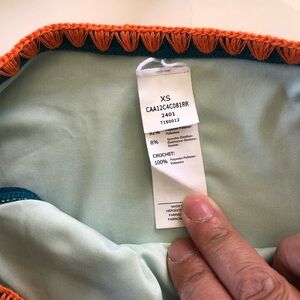 Stylish teal bikini with vibrant orange accents. Ideal for beach or pool days.