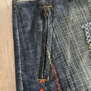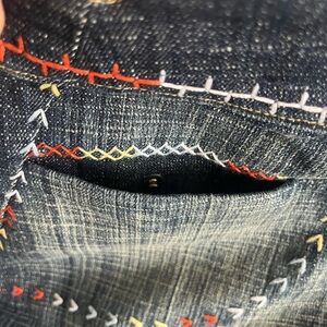 Stylish denim mini skirt featuring colorful stitching details. Perfect for casual outings.