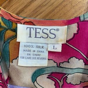 Tess vintage tank top scoop neck silk purple pink orange floral large. Brighten your wardrobe with this colorful floral tank top. Perfect for any outing. 100 percent silk. Super breathable. Tag is slightly discolored. Item in otherwise perfect condition.