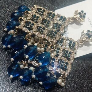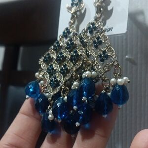 These stunning earrings feature a captivating blue and gold design, perfect for adding a touch of elegance to any outfit.