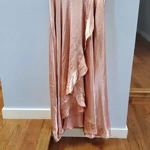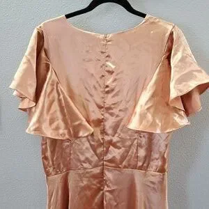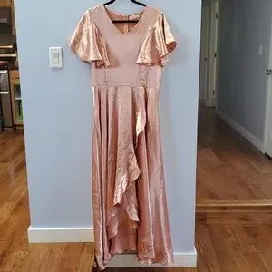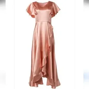 Chic high low dress in peach. Features flutter sleeves and elegant drape. Perfect for any occasion.