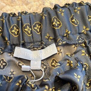 Elegant wide leg pants. Features intricate gold pattern on blue fabric. Perfect for stylish occasions.