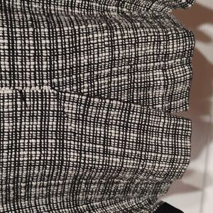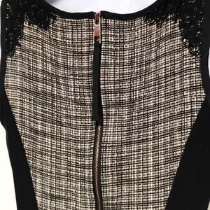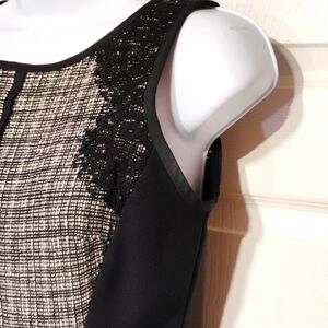 This is an adorable dress made by LOFT made of cotton and polyester. black on sides with black and white center. sleeveless lace on top shoulder areas.. long silver zipper up the back with long black pull tabs. nice stitch work. size 2 petite