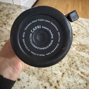 Hydraflow travel mug with handle. Sleek black design. Perfect for hot or cold drinks. 40 oz