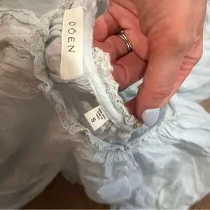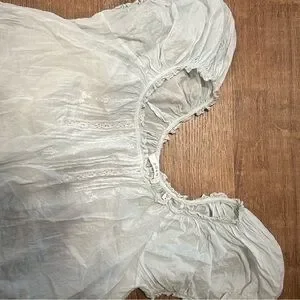 The Doen blouse in a serene blue hue features charming puff sleeves and a ruched neckline, offering a romantic and vintage-inspired look. Crafted from a light, airy fabric, this top drapes beautifully, making it a versatile addition to any wardrobe. Size small, EUC