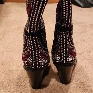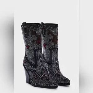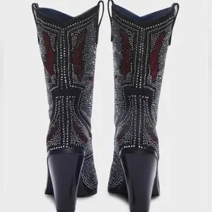 The AZALEA WANG Hype Me Up Rhinestone Chunky Heel Bootie is a glamorous fashion statement. Featuring a high ankle shaft, this cowboy inspired bootie is made with a pointed toe shape, chunky cone heel, smooth textile base, allover rhinestone gem detailing, and a pull-on fit. You better work, gal.